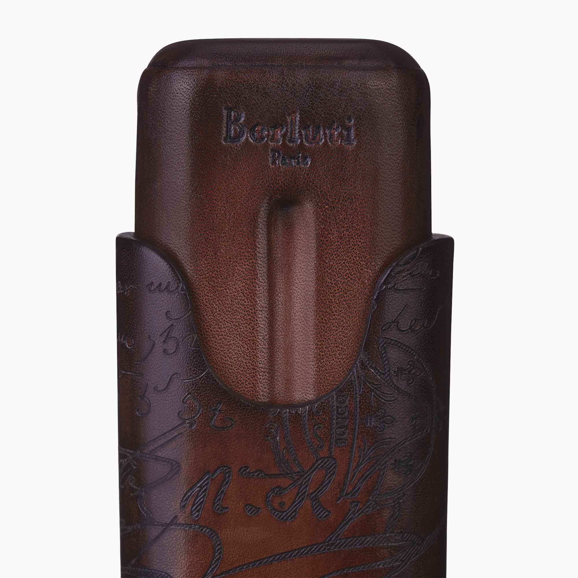 Questo portasigari presenta i turbinii dell’emblematica firma Scritto sul fronte, in pelle “bruciata” di alta qualità e con impresso il testo e il sigillo del manoscritto originale del XVIII secolo che ne è stato l’ispirazione. È realizzato interamente con la tecnica della “foderatura”, che prevede il posizionamento di pezzi di pelle inumidita su una forma di legno. Una volta che la pelle ha preso forma, la forma viene rimossa, lasciando intatto il delicato articolo in pelle.